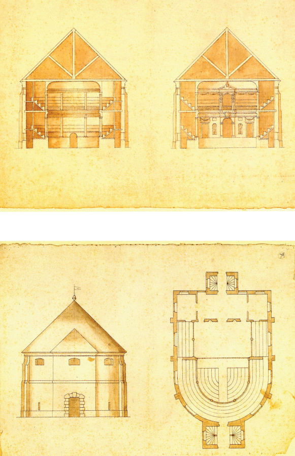 Seventeenth century drawings by John Webb of plans for an early indoor theatre that was probably never built. They show the curved galleries and boxes for the audience to sit in beside the stage. Held at Worcester College Oxford.