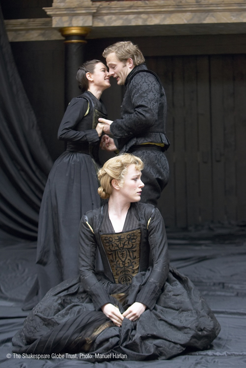 Shakespeare’s theatre did not use scenery. At most, cloth ‘stage hangings’ could be draped over the tiring house at the back of the stage. These did not picture the location of the stage. These did not picture the location of the scene, but they did have certain associations. For instance, they sometimes used black stage hangings when performing tragedies.